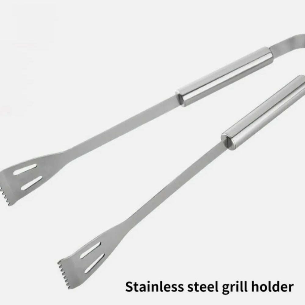 The 3 PCS set includes spatula, fork and tongs. The hollowing design  of the spatula is make sure the oil from your food will able to drop back into the grill and not on the plate for serving.