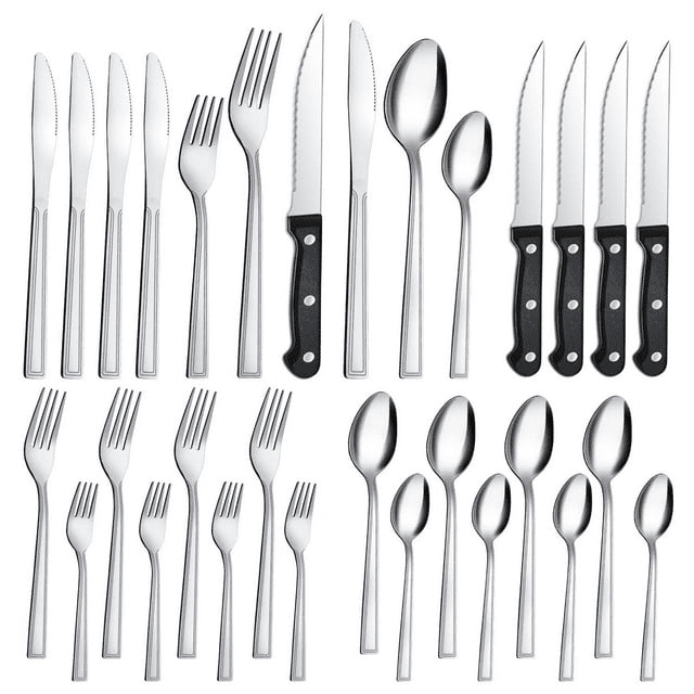 [premium 24-piece silverware set]this silverware set includes 4 dinner forks, 4 salad forks, 4 dinner knives, 4dinner spoons, 4 teaspoons and additional 4 steak knives, which suitable for 4 people.