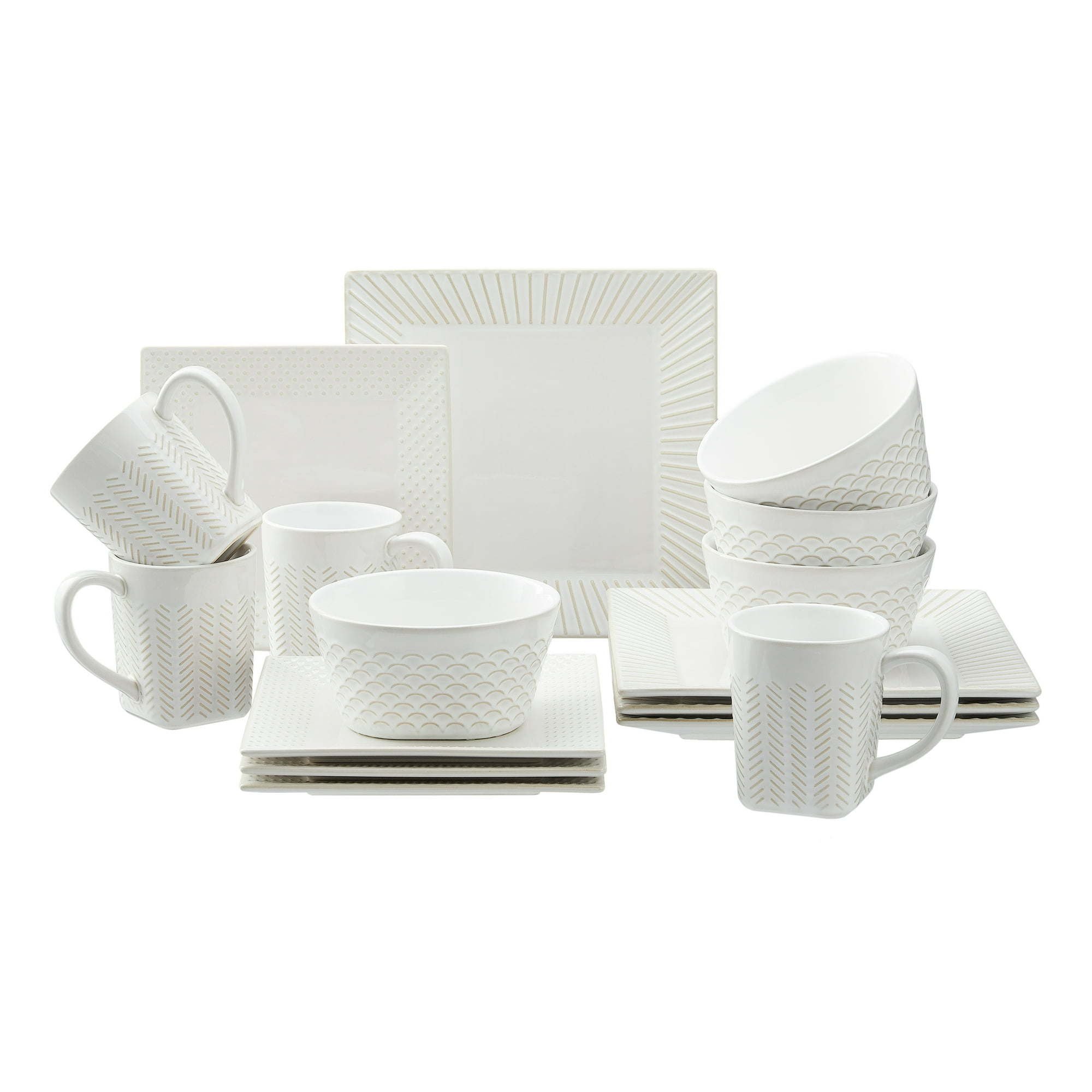 Welcome friends, family, and more to your table with the fresh look of the Better Homes & Gardens 16-Piece Farmhouse Square Dinnerware Set. The set has a beautiful white reactive finish with a neutral tan edging pattern and includes striped dinner plates, dotted salad plates, scalloped-pattern bowls, and geometric herringbone-designed mugs. The complementary patterns allow you to create a casual, relaxed look for everyday meals or special occasions. Including create service for four, it's a great starter set or the perfect update for your existing dinnerware collection. Dishwasher and microwave safe for easy care and use, the Better Homes & Gardens 16-Piece Farmhouse Square Dinnerware Set can be combined with additional sets, accessories, or open stock pieces (sold separately) to expand your collection.