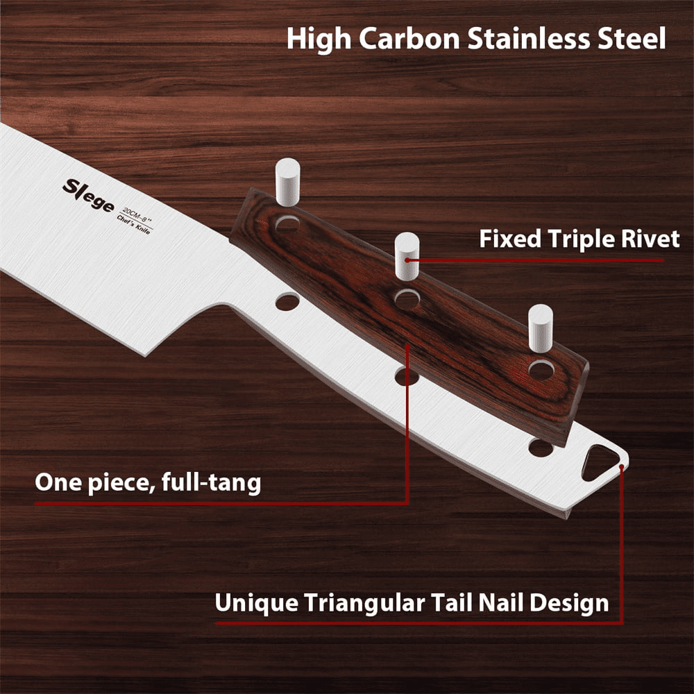??[innovative design]our knives boast a full-tang design with triple steel nails for enhanced stability and balance. The ergonomic handle provides a natural grip, offering comfort and confidence during use. Unique triangular tail nails facilitate quick drying to prevent stains, rust, and pitting, ensuring the longevity of your knives.