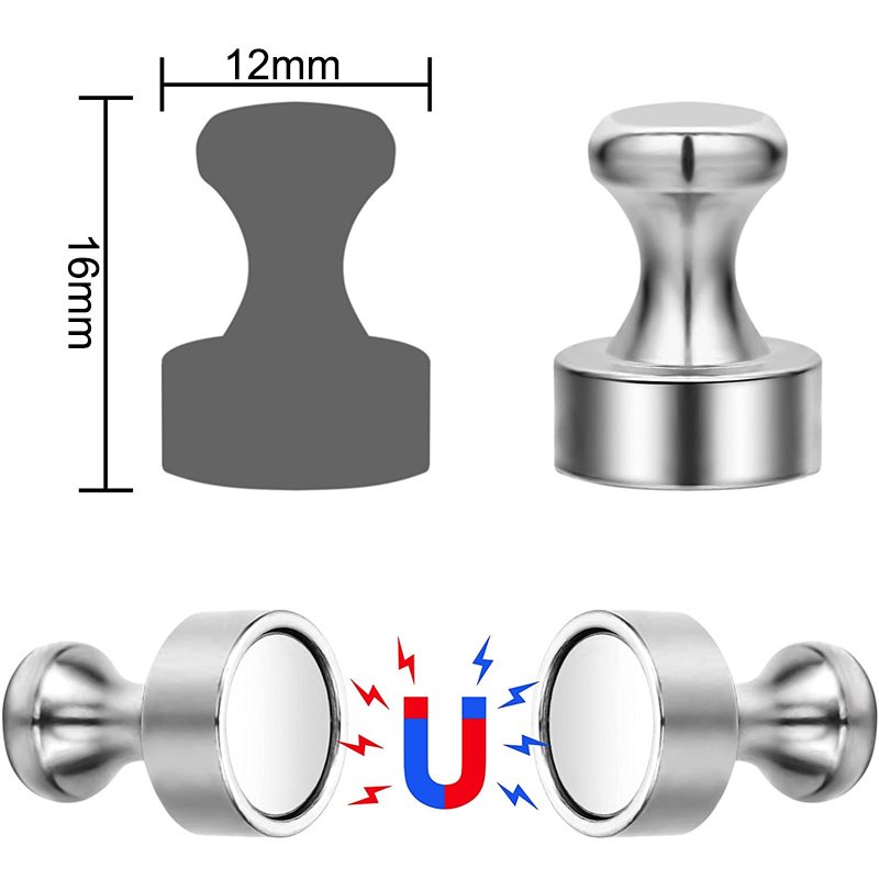 PERFECT SIZE & DESIGN - Each magnetic push pin is 16 mm tall and has a 12 mm base diameter. It's unique pawn shaped design makes for easy removal of magnets and allows for secure hanging of basically anything with a large enough eye hole. Big enough to hang kitchen utensils and small enough to not clutter your whiteboard.
