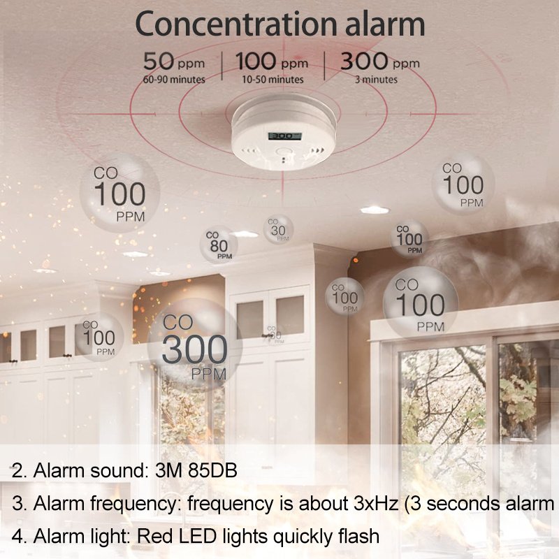 1. Alarm concentration: 50 ppm; 60~90 minutes/ 100ppm; 10~40 minutes; 300ppm for 3 minutes